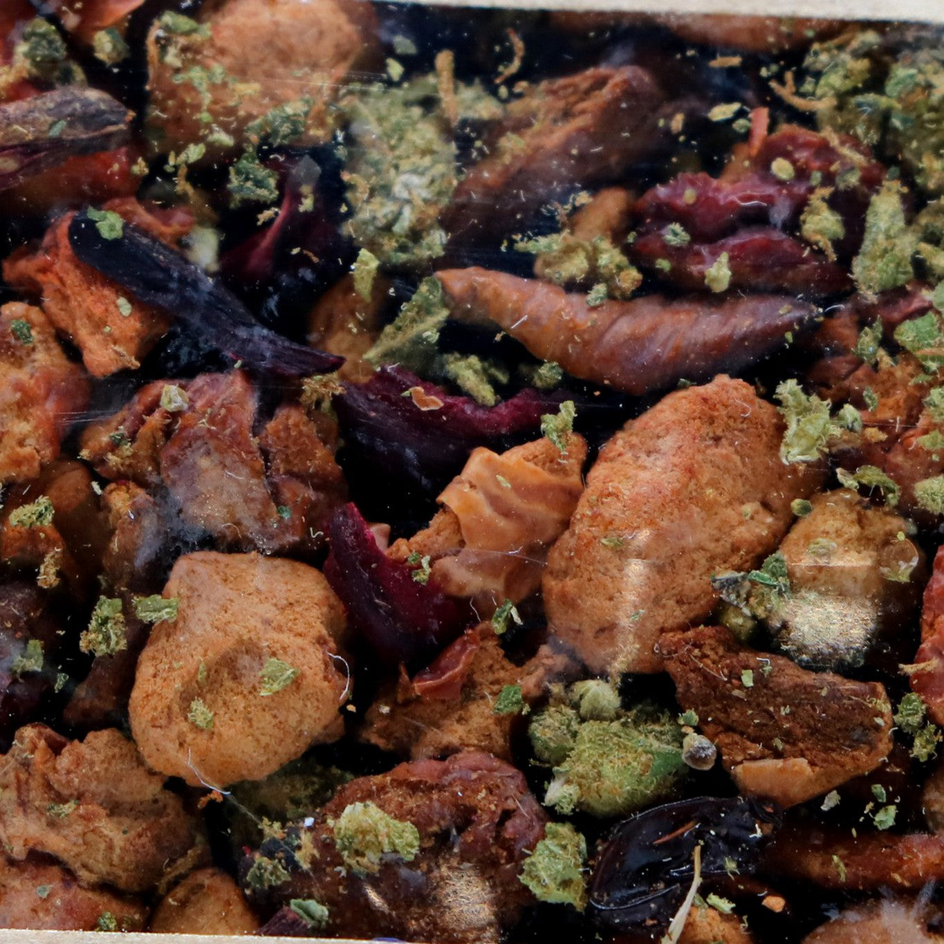 Fleurs de CBD (10%), hibiscus, cynorrhodon, baie de sureau (3%), extrait de vanille, arôme naturel (cassis), fleurs de bleuet, vanille (1%)